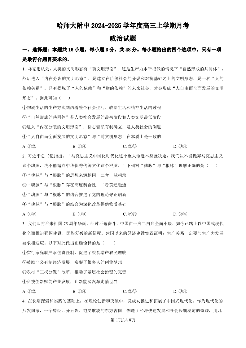 黑龙江省哈尔滨师范大学附属中学2025届高三上学期10月月考政治试题(原卷版)