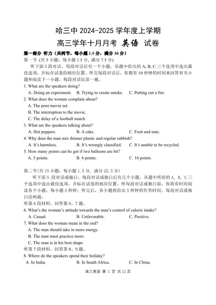 黑龙江省哈尔滨市第三中学校2025届高三上学期10月月考英语试卷