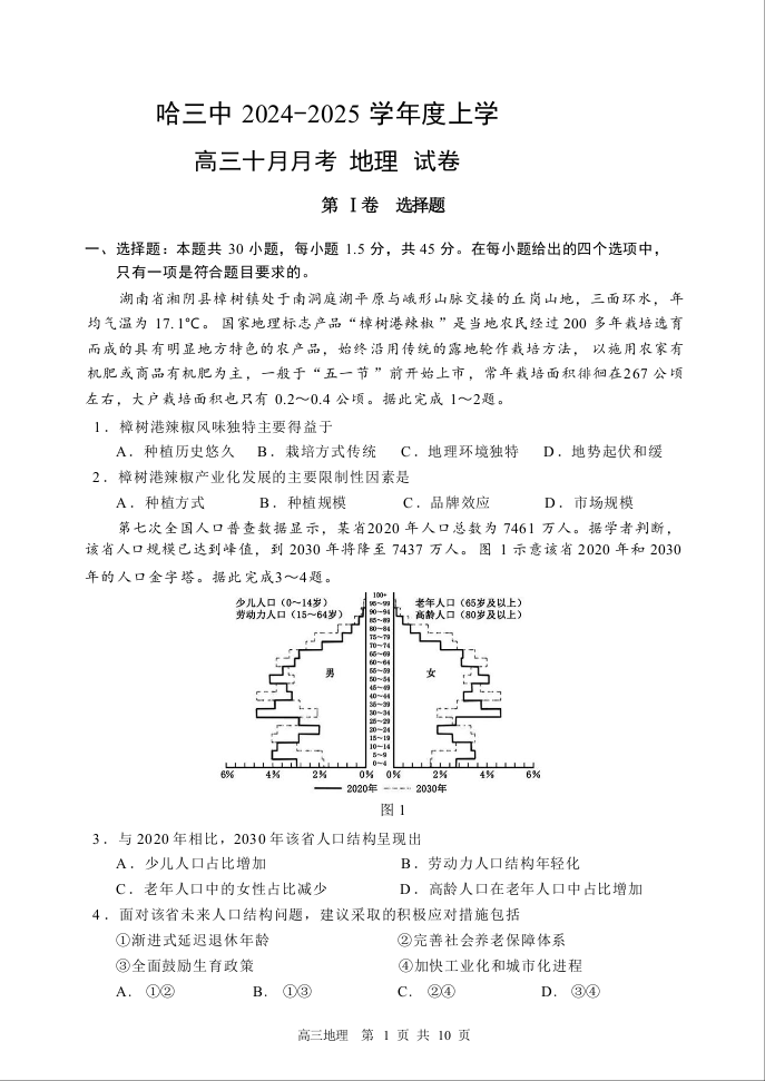 黑龙江省哈尔滨市第三中学校2025届高三上学期10月月考地理试卷