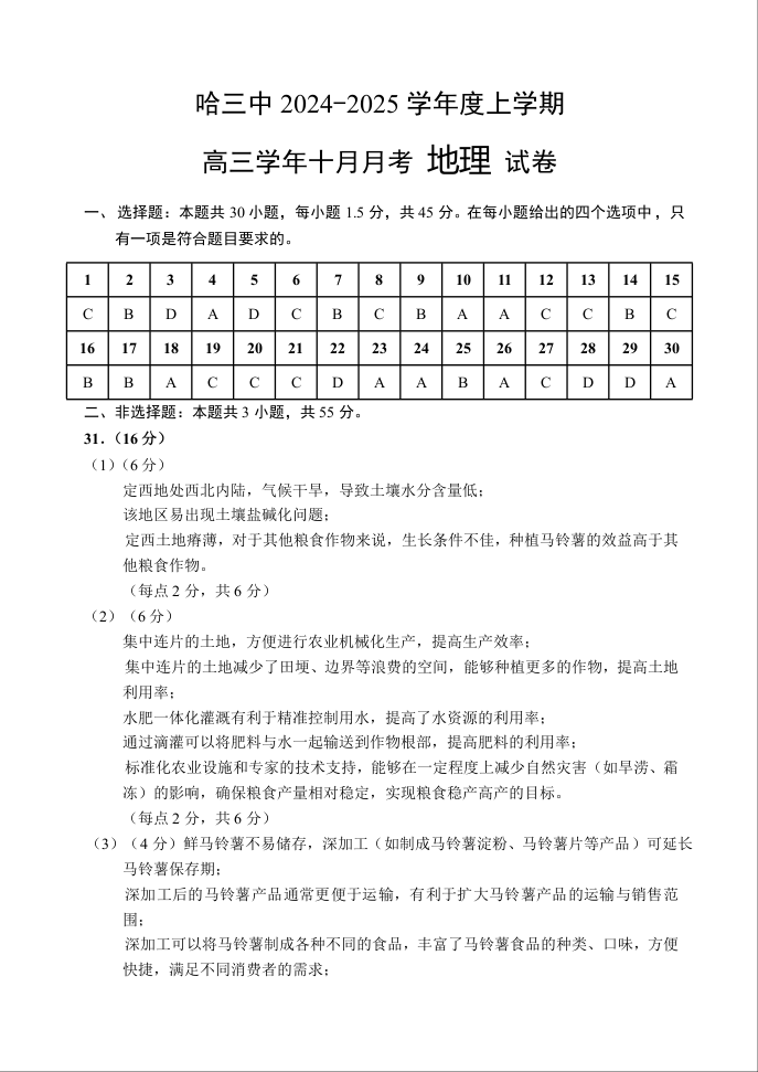 黑龙江省哈尔滨市第三中学校2025届高三上学期10月月考地理答案