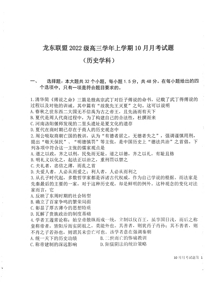 黑龙江省部分高中2025届高三上学期10月月考历史试题