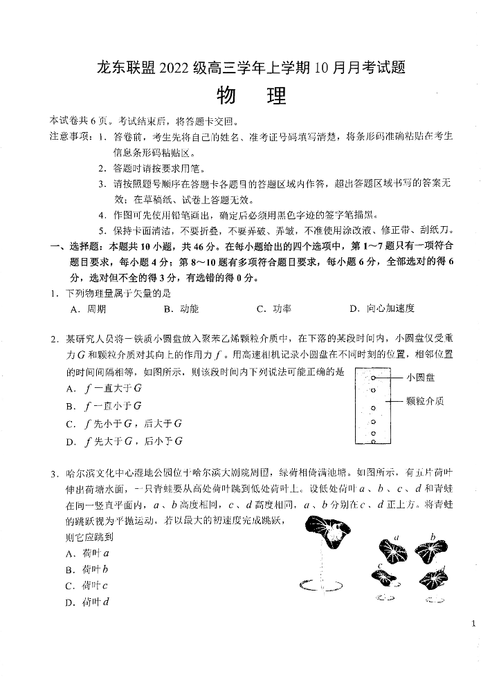 黑龙江省部分高中2025届高三上学期10月月考物理试题