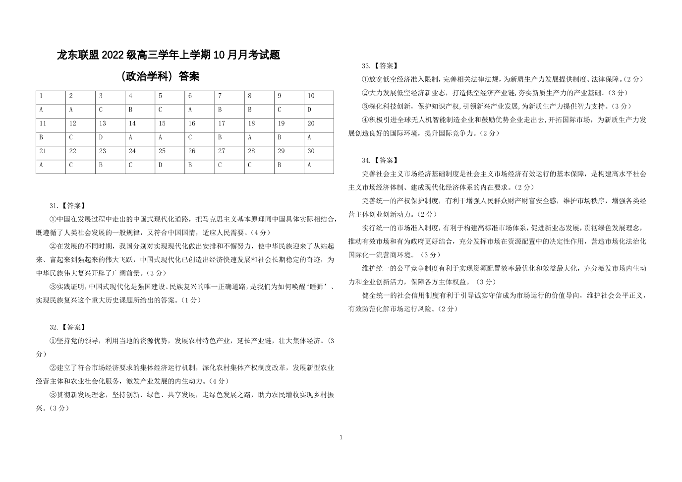 黑龙江省部分高中2025届高三上学期10月月考政治答案