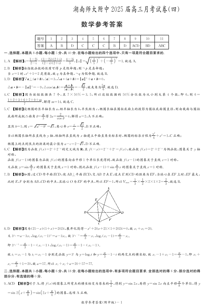 湖南师范大学附属中学2025届高三上学期月考(四)数学答案