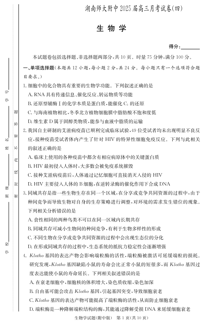 湖南师范大学附属中学2025届高三上学期月考(四)生物