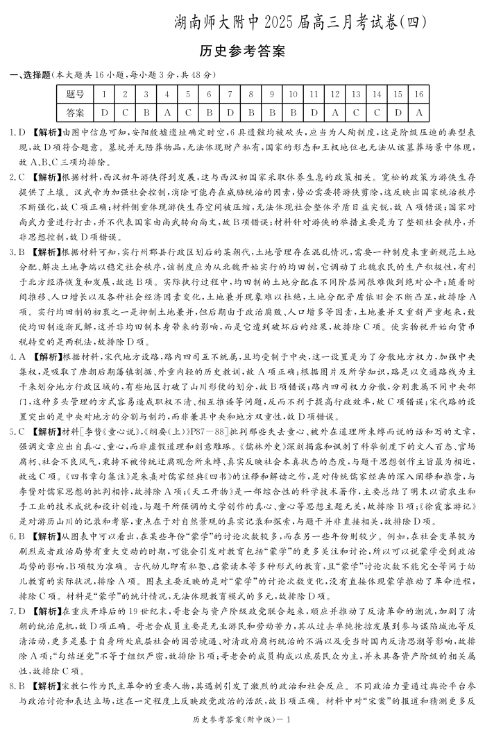 湖南师范大学附属中学2025届高三上学期月考(四)历史答案