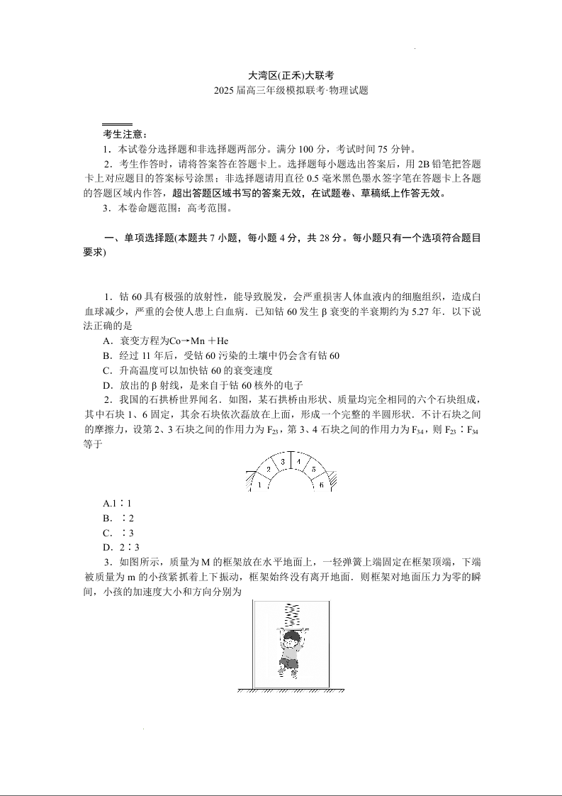 广东省大湾区(正禾)大联考2025届高三上学期12月模拟联考物理Word版含答案
