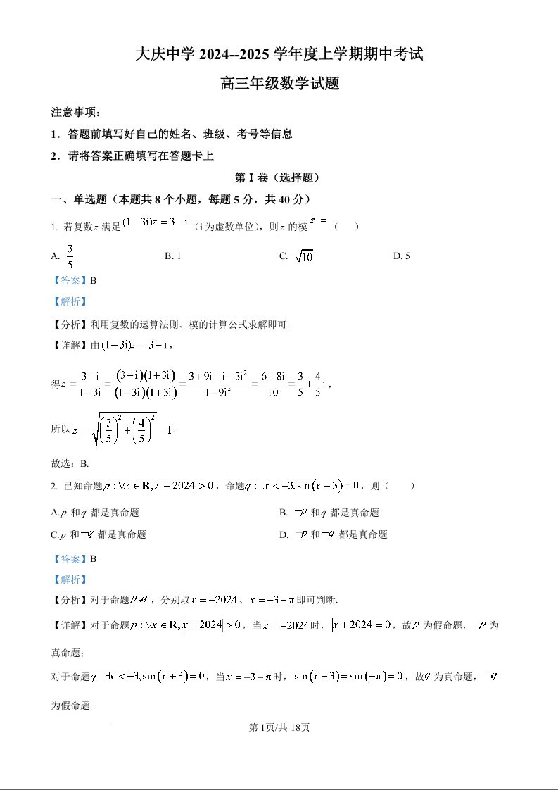 黑龙江省大庆市大庆中学2025届高三上学期10月期中考试数学(解析版)