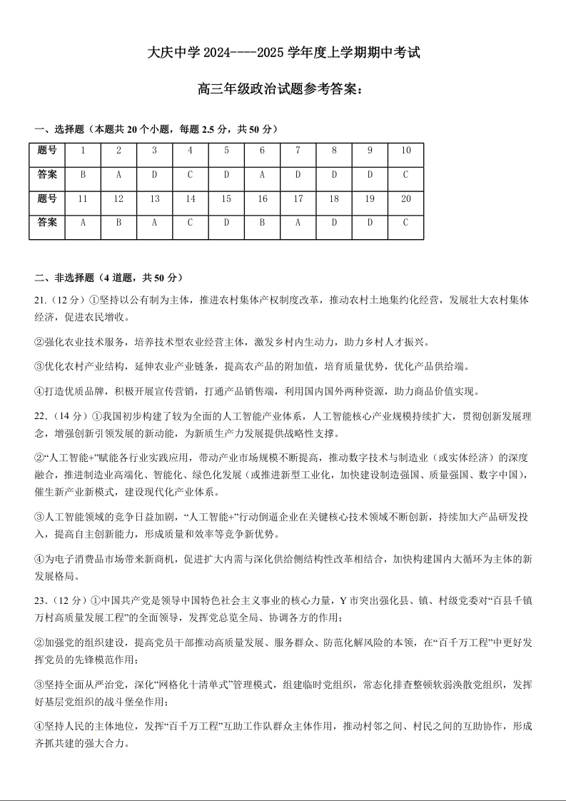 黑龙江省大庆市大庆中学2025届高三上学期10月期中考试政治答案