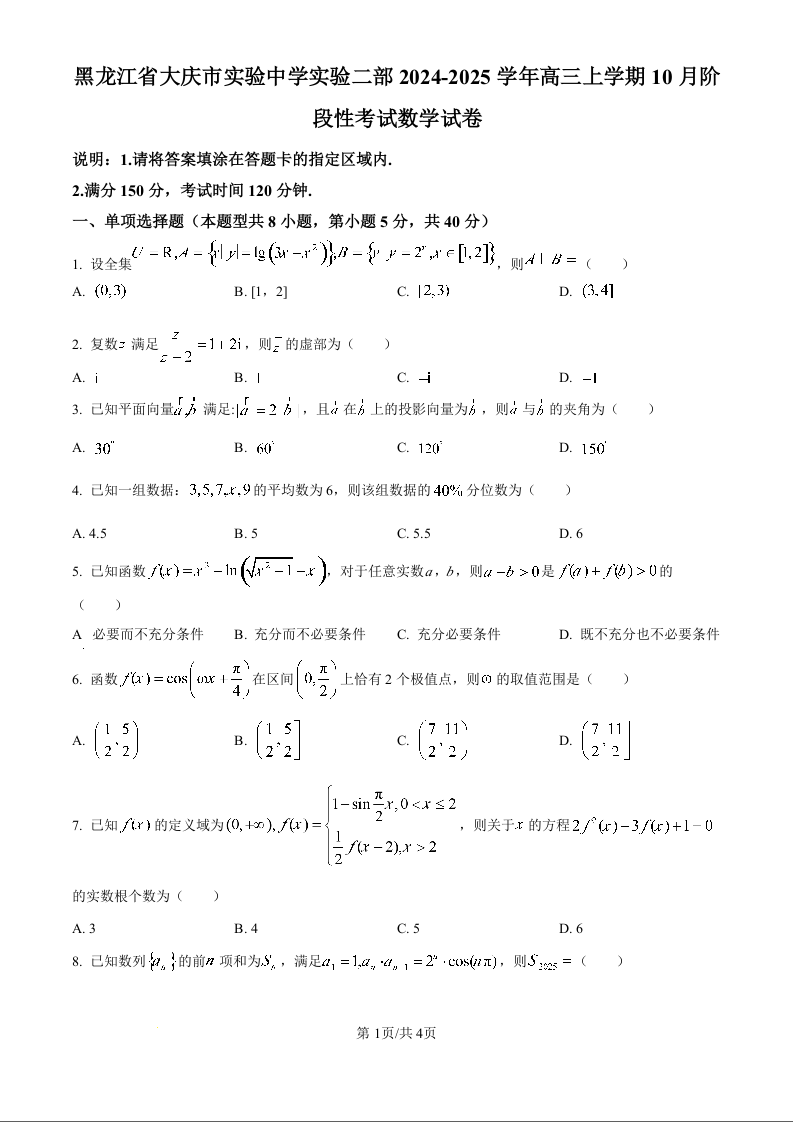黑龙江省大庆市实验中学实验二部2022级高三下学期10月月考数学试卷(原卷版)