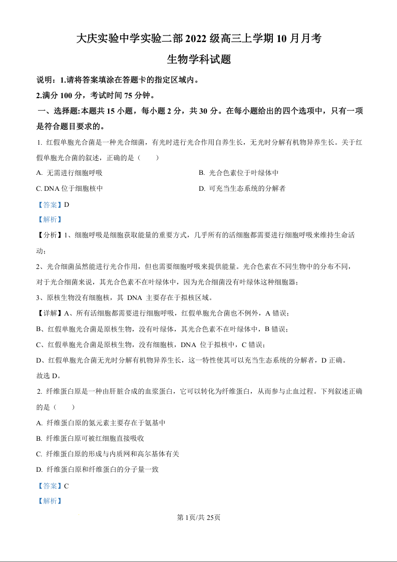 黑龙江省大庆市实验中学实验二部2022级高三下学期10月月考生物试卷(解析版)