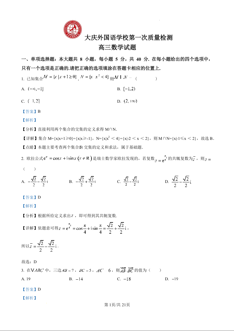 黑龙江省大庆外国语学校2025届高三上学期第一次教学质量检测数学试卷(解析版)