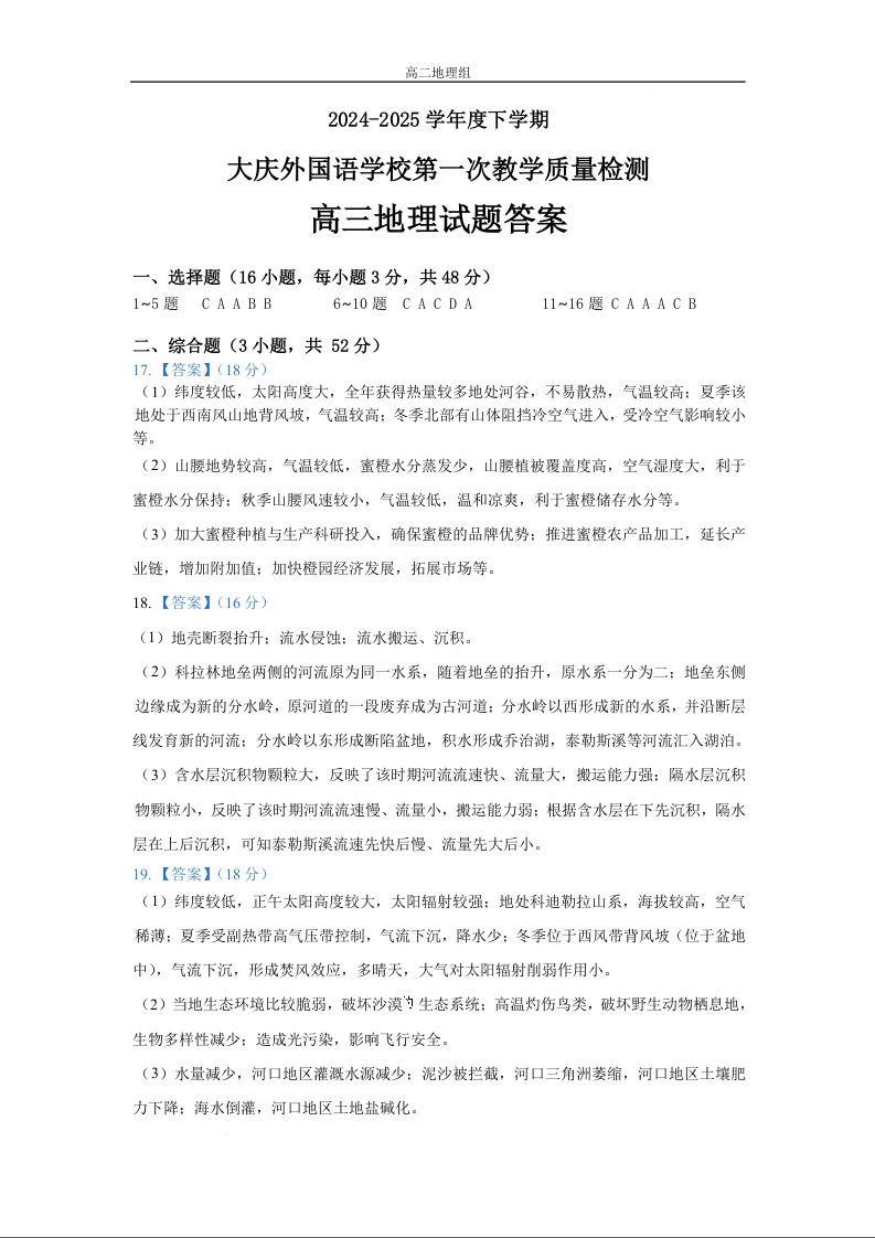 黑龙江省大庆外国语学校2025届高三上学期第一次教学质量检测地理答案