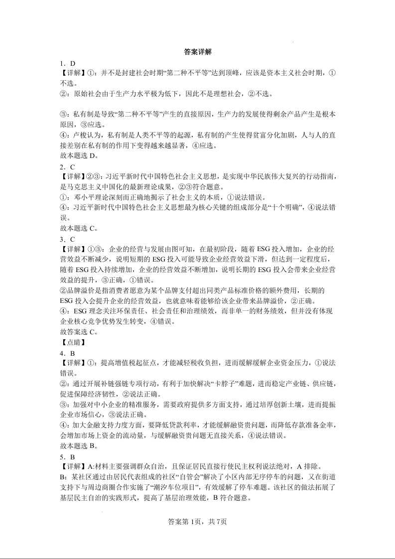 黑龙江省大庆外国语学校2025届高三上学期第一次教学质量检测政治答案详解