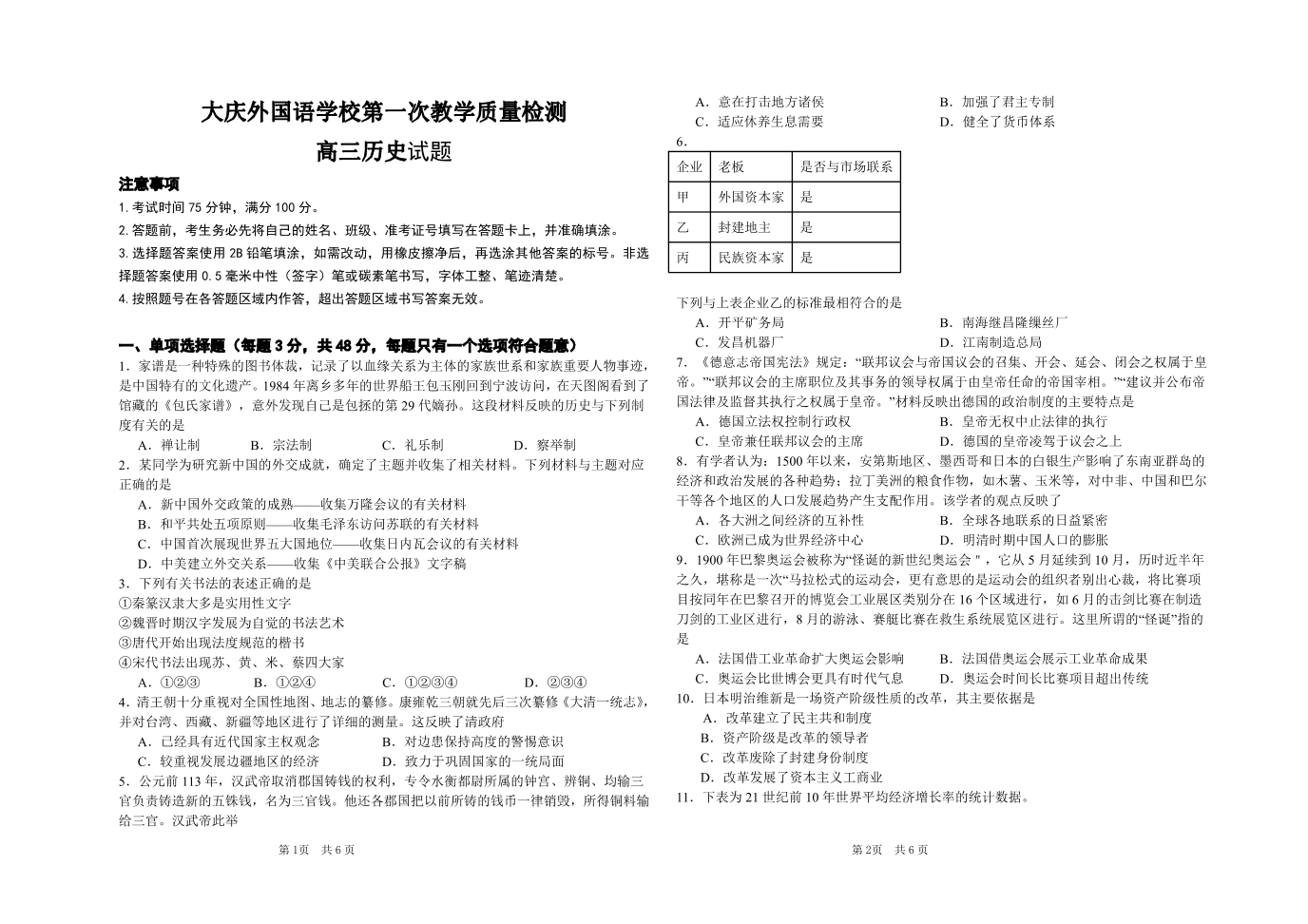 黑龙江省大庆外国语学校2025届高三上学期第一次教学质量检测历史