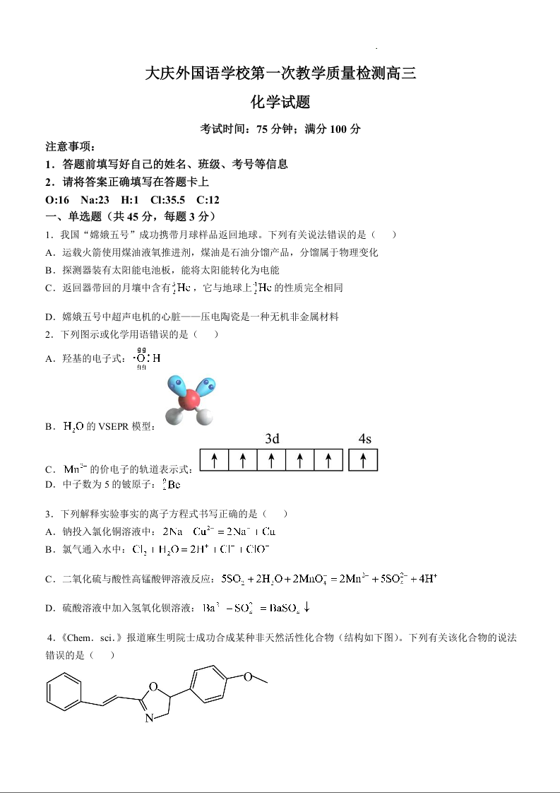 黑龙江省大庆外国语学校2025届高三上学期第一次教学质量检测化学+答案