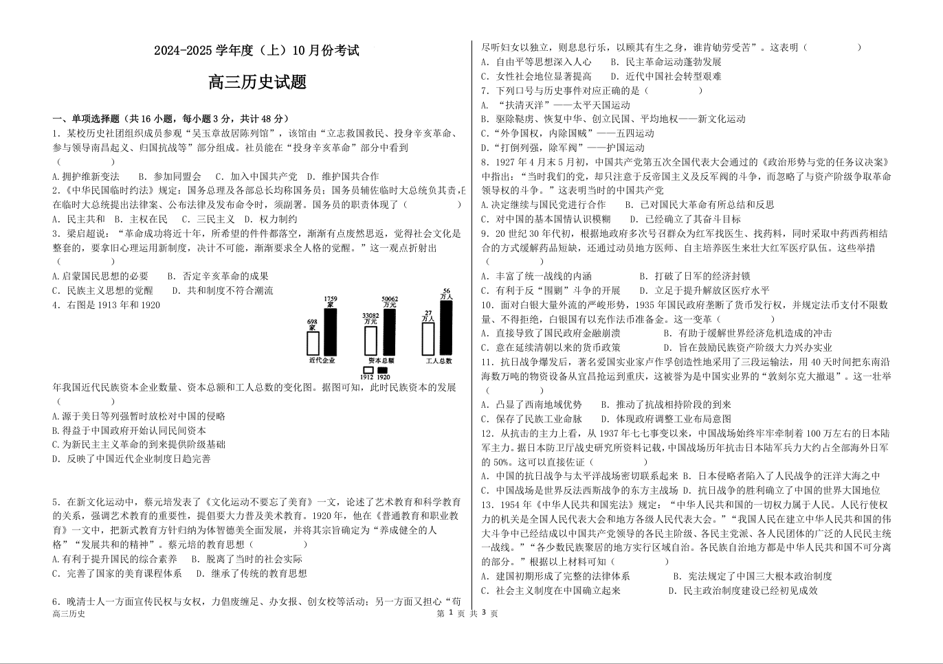 黑龙江省佳木斯市第八中学2025届高三上学期10月月考历史