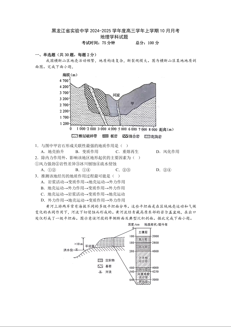 黑龙江省实验中学2024-2025学年度高三学年上学期第二次月考地理试卷