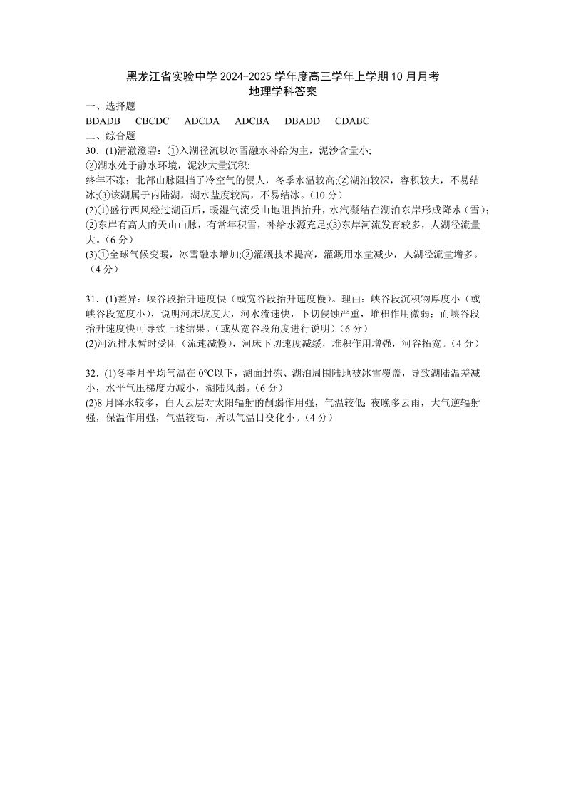 黑龙江省实验中学2024-2025学年度高三学年上学期第二次月考地理答案