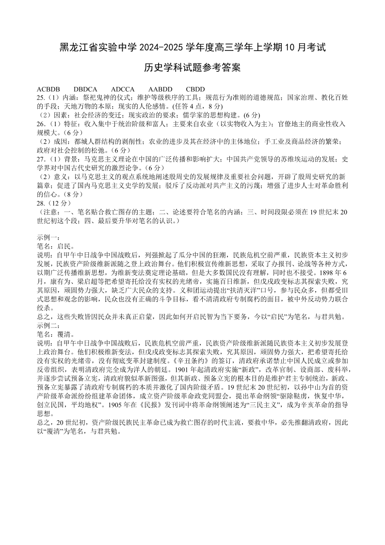 黑龙江省实验中学2024-2025学年度高三学年上学期第二次月考历史答案