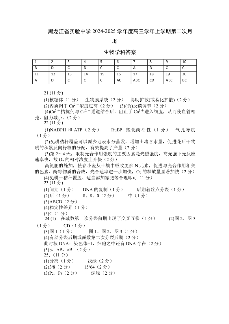 黑龙江省实验中学2024-2025学年度高三学年上学期第二次月考生物答案
