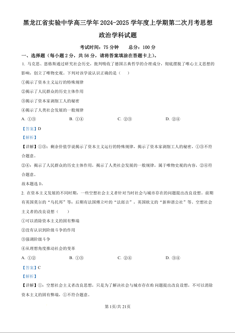 黑龙江省实验中学2024-2025学年度高三学年上学期第二次月考政治试题(解析版)