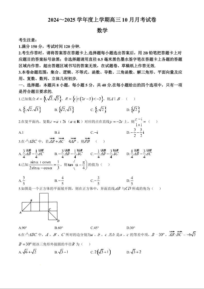 黑龙江省绥化市绥棱县第一中学2025届高三上学期10月月考数学+答案