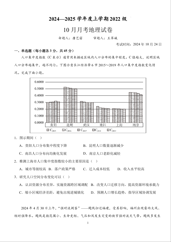 湖北省荆州市沙市中学2024-2025学年度上学期2022级10月月考地理+答案