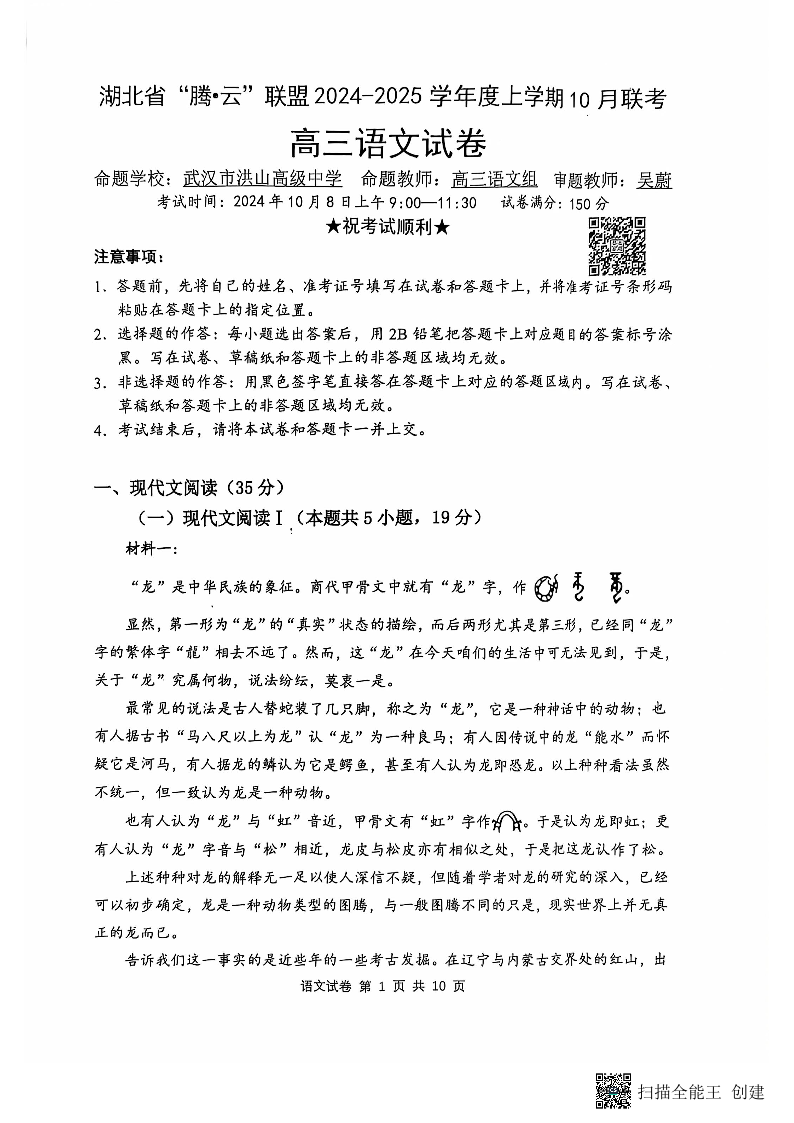 湖北省腾云联盟2024-2025学年度上学期10月联考语文试卷