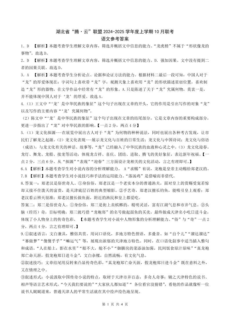 湖北省腾云联盟2024-2025学年度上学期10月联考语文答案