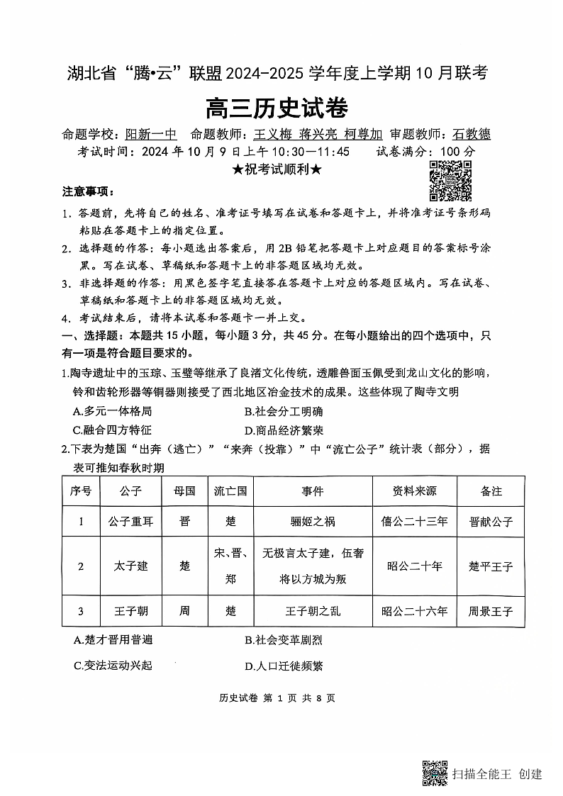 湖北省腾云联盟2024-2025学年度上学期10月联考历史试卷