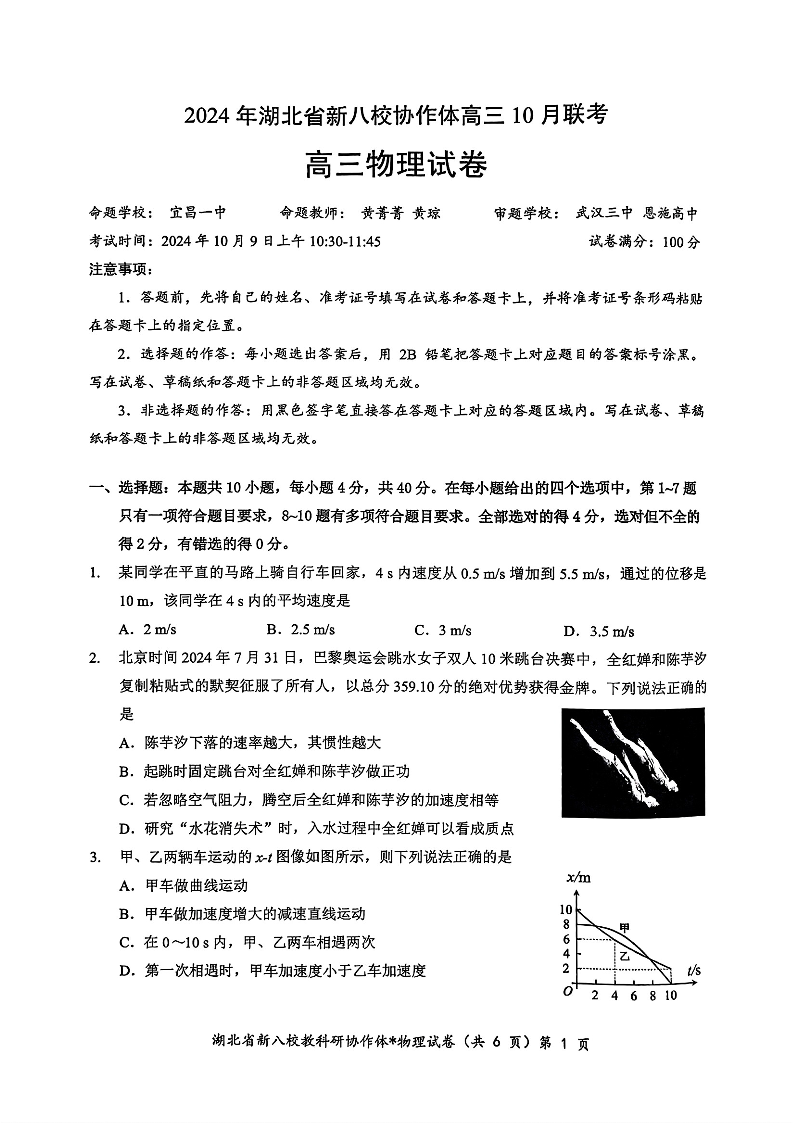 湖北省新八校协作体2025届高三10月联考物理试卷