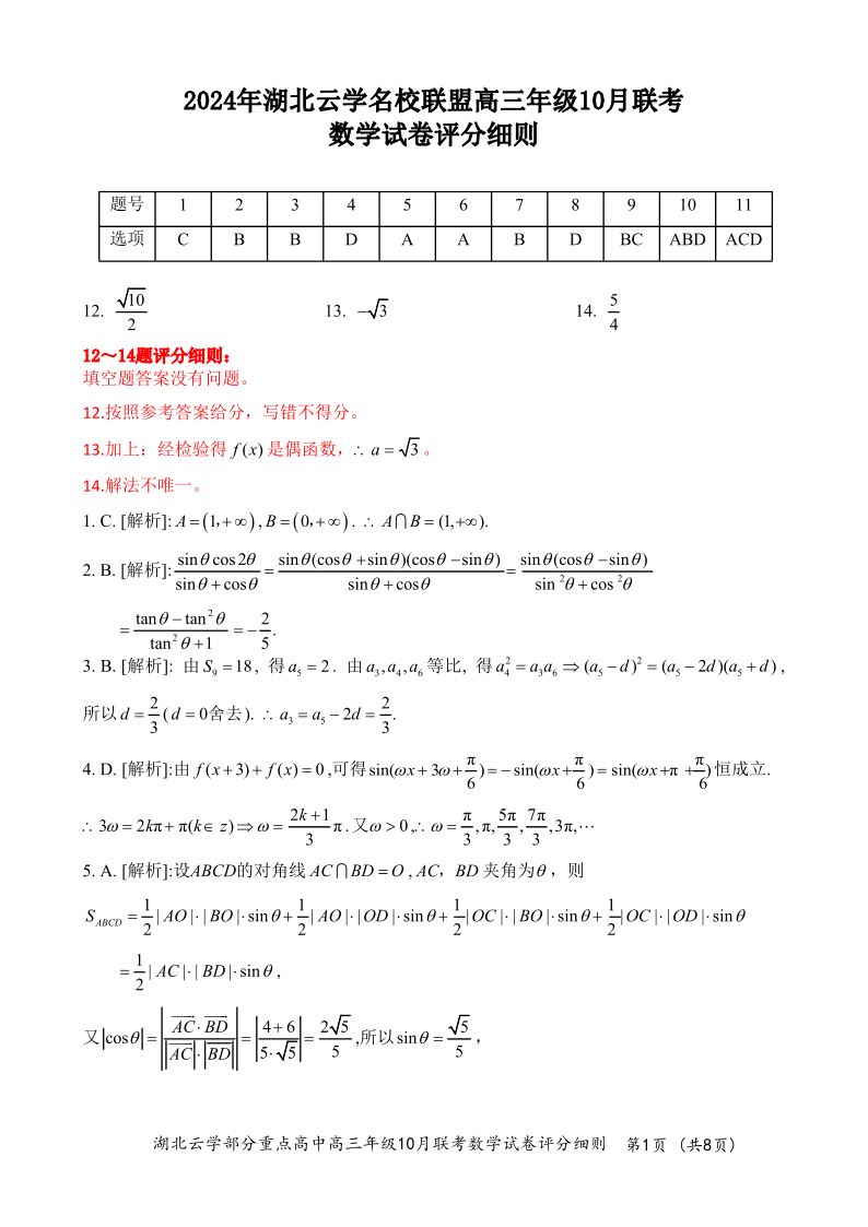湖北云学部分重点高中联盟2025届高三年级10月联考数学答案
