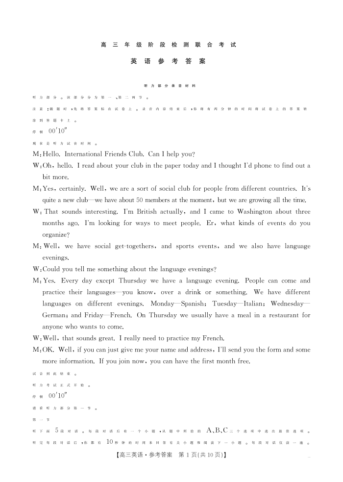 湖南省部分高中2025届高三年级阶段检测联合考试英语答案