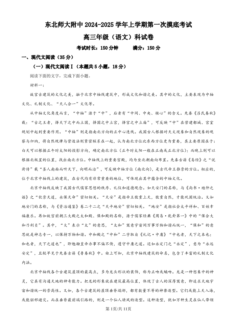 吉林省东北师范大学附属中学2024-2025学年高三上学期第一次摸底考试语文试卷(原卷版)