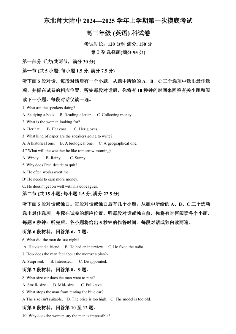 吉林省东北师范大学附属中学2024-2025学年高三上学期第一次摸底考试英语试卷(解析版)