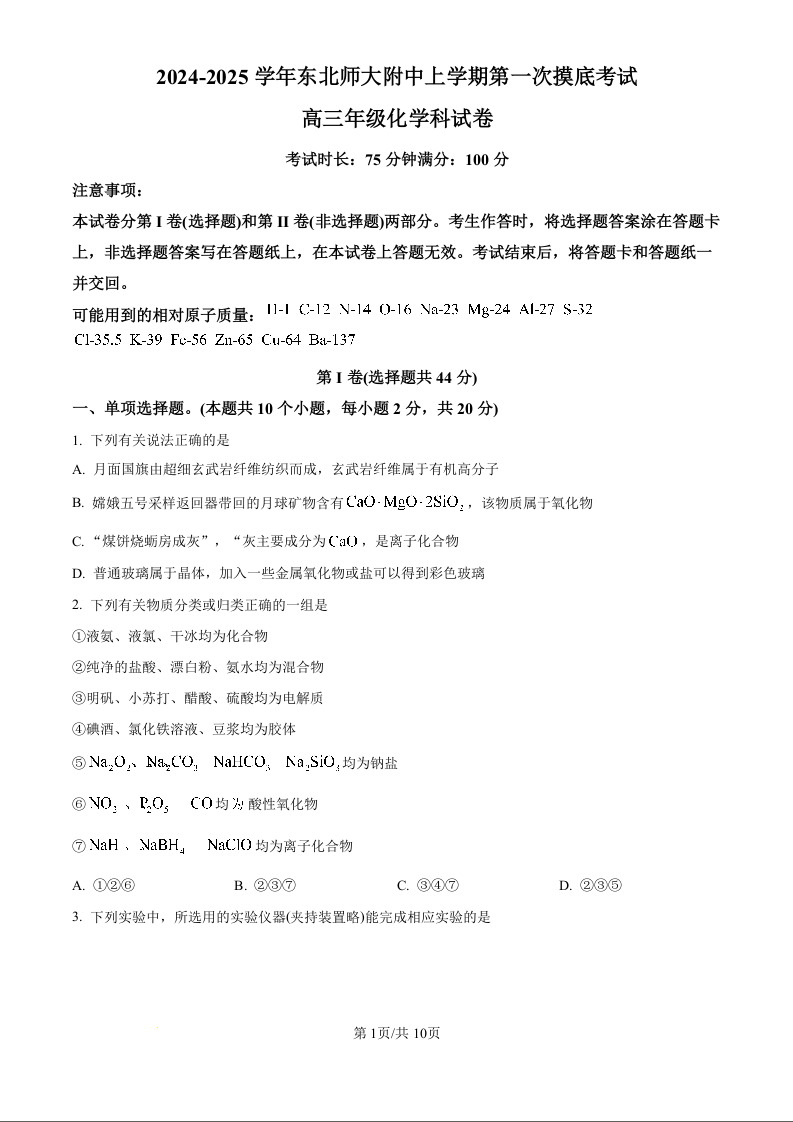 吉林省长春市东北师范大学附属中学2024-2025学年高三上学期第一次摸底考试 化学试题(原卷版)