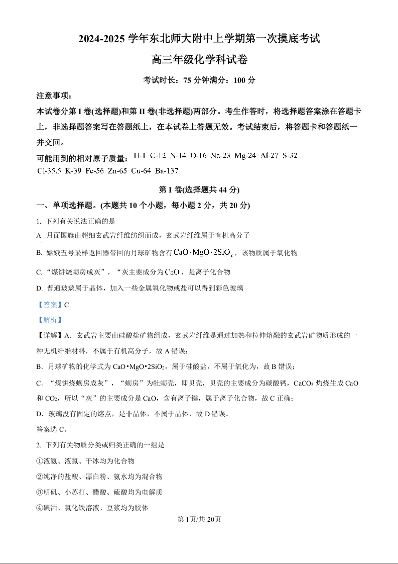 吉林省长春市东北师范大学附属中学2024-2025学年高三上学期第一次摸底考试 化学试题(解析版)
