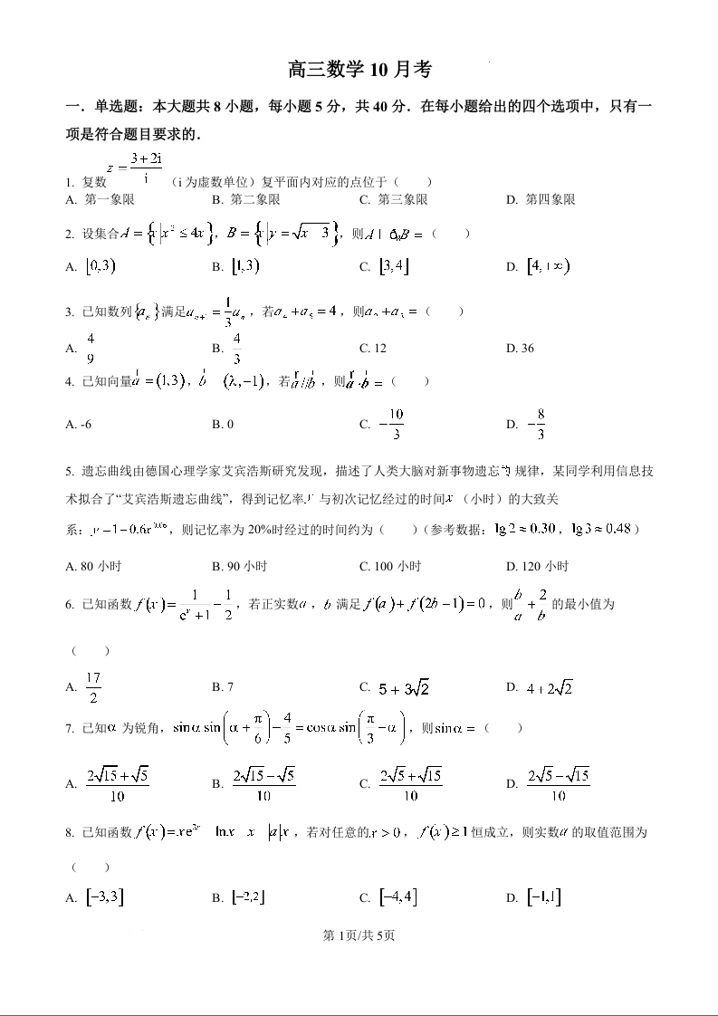 吉林省通化市梅河口市第五中学2025届高三上学期10月月考数学试题(原卷版)