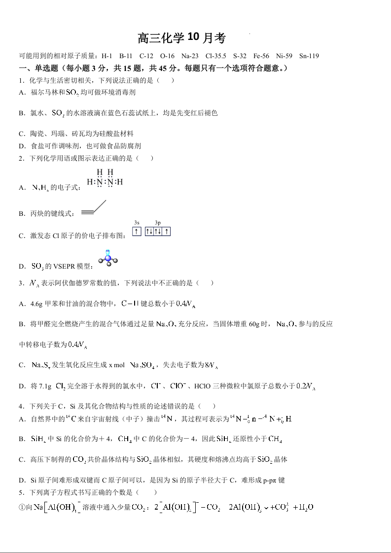 吉林省通化市梅河口市第五中学2025届高三上学期10月月考化学