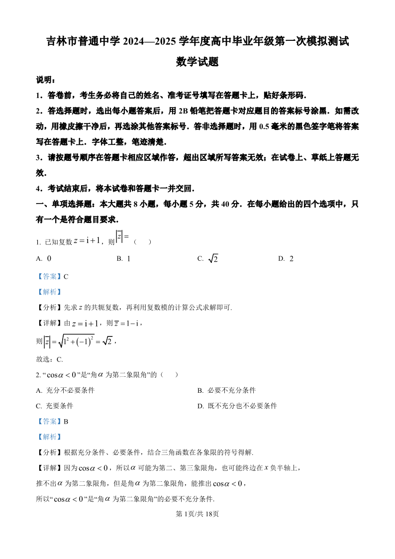 吉林市普通中学2025届高三上学期第一次模拟测试(解析版)