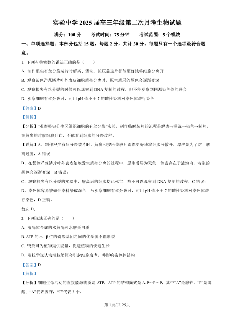 江苏省南通市海安市实验中学2025届高三年级第二次月考生物试题(解析版)