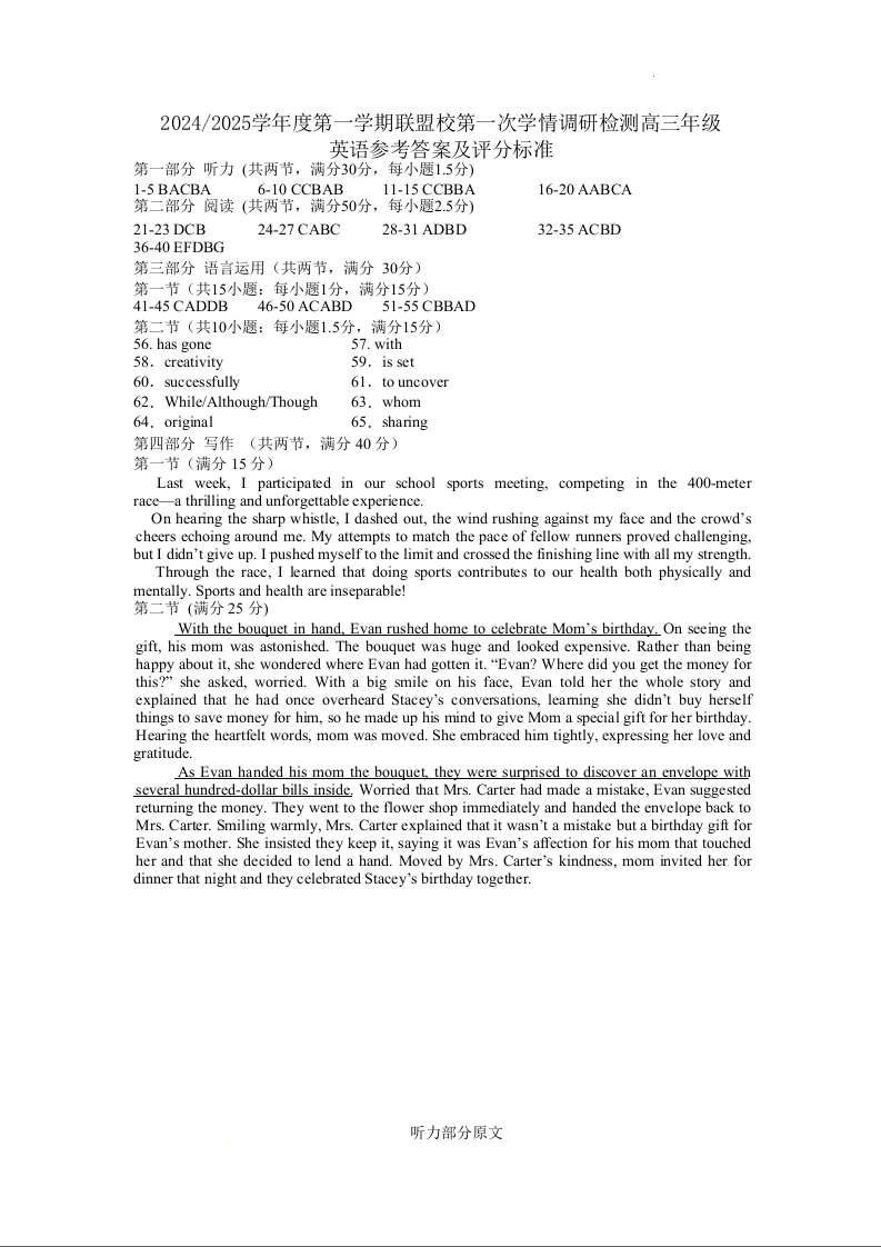 江苏省盐城市五校2024-2025学年度上学期第一次学情调研检测英语答案
