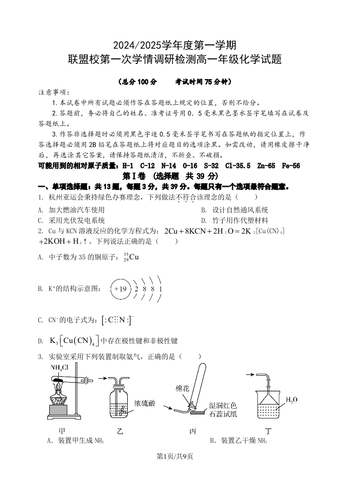 江苏省盐城市五校2024-2025学年度上学期第一次学情调研检测化学试卷