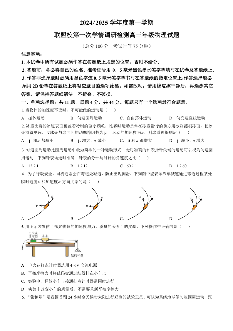 江苏省盐城市五校2024-2025学年度上学期第一次学情调研检测物理试题+答案