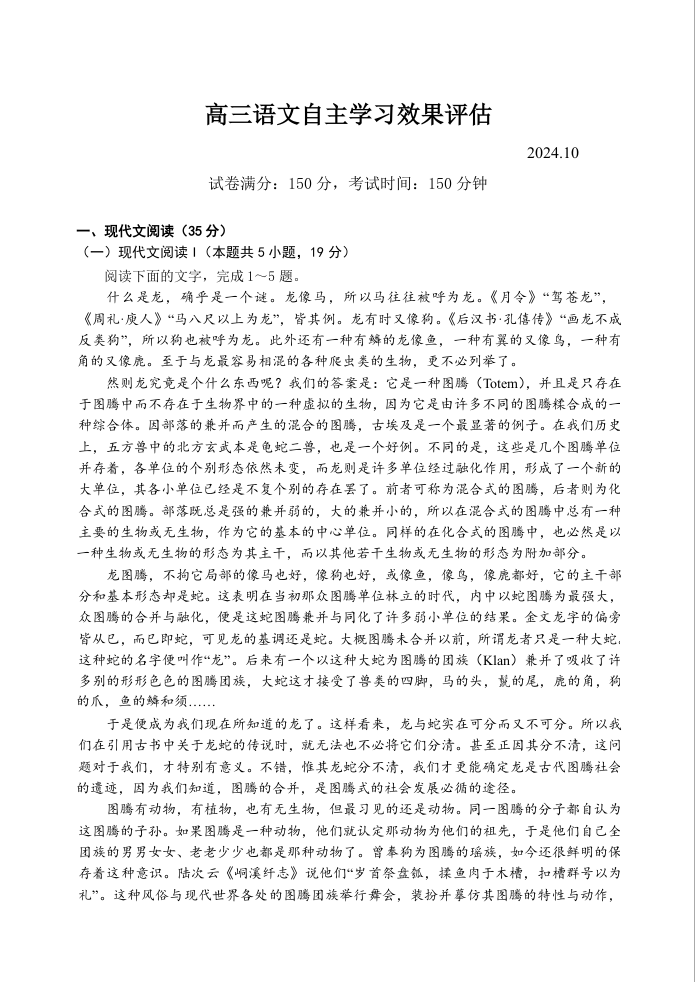江苏省扬州中学2025届高三上学期10月月考语文+答案