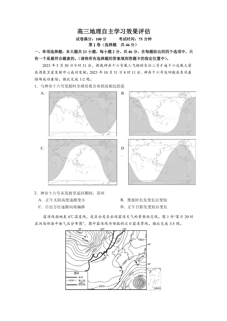 江苏省扬州中学2025届高三上学期10月月考地理+答案