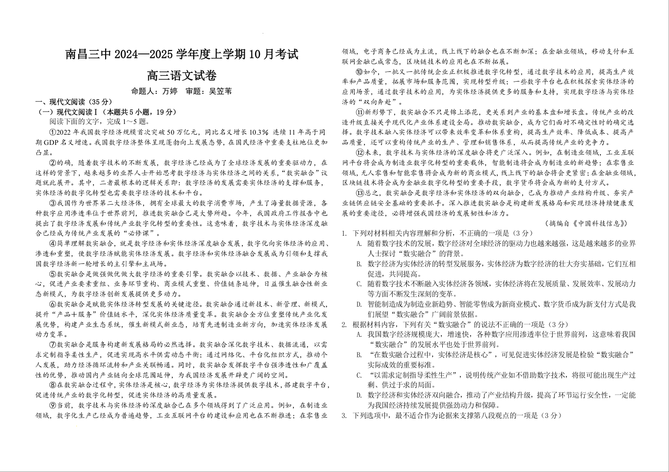 江西省南昌市第三中学2025届高三上学期10月月考语文+答案