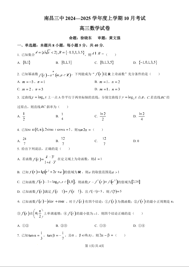 江西省南昌市第三中学2025届高三上学期10月月考数学试题(原卷版)