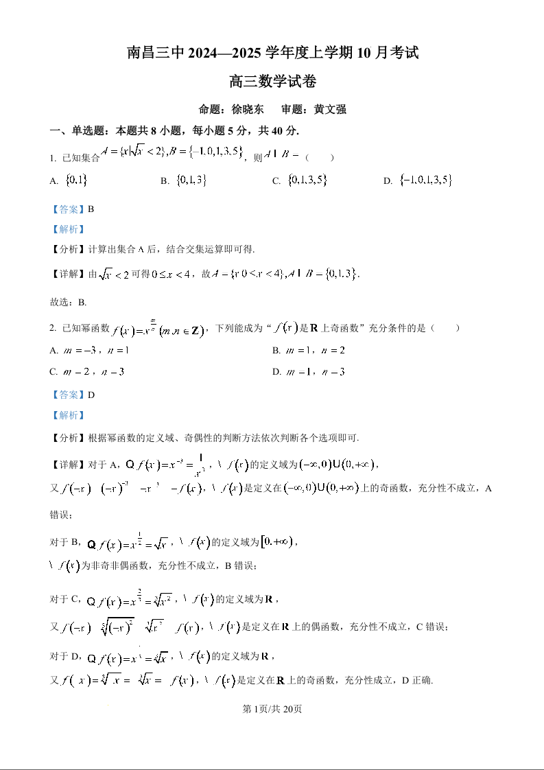 江西省南昌市第三中学2025届高三上学期10月月考数学试题(解析版)